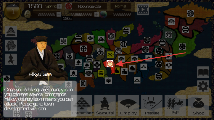 2、地图界面,点击红色标识的领地,可执行攻击、城镇发展等指令。