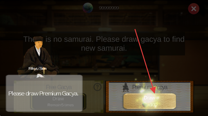 3、抽卡界面,点击【Premium Gacya】区域的【Draw x100】按钮,抽取新武士。