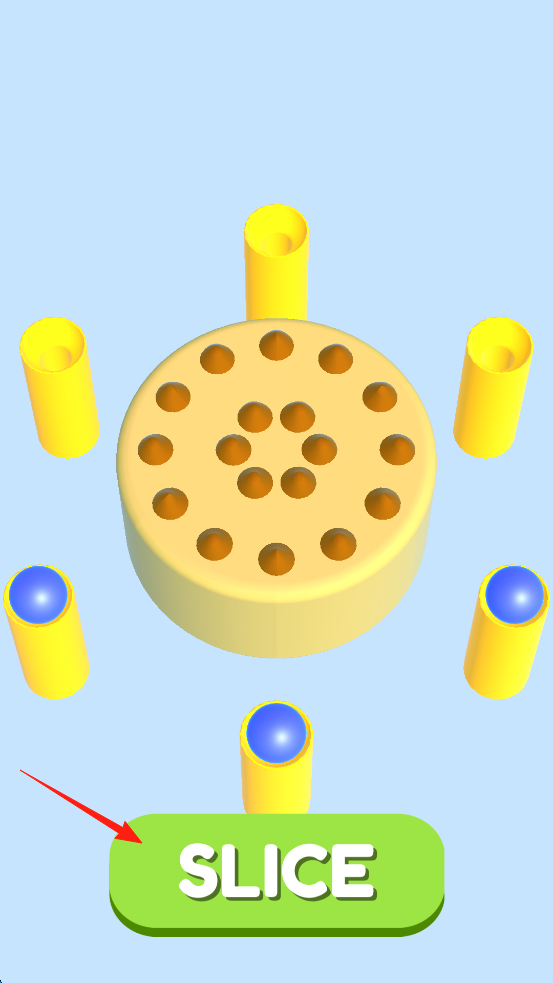 1、面对黄色圆盘与周围圆柱、蓝球,点击“SLICE”启动切割,圆盘似有多层结构,切割后会暴露内部,需通过这一操作,开启后续蓝球与圆柱的匹配流程。