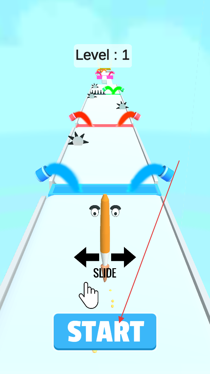 1、进入Level:1界面,点击“START”按钮启动游戏,操控画笔左右滑动,躲避尖刺等障碍,开启闯关之旅。