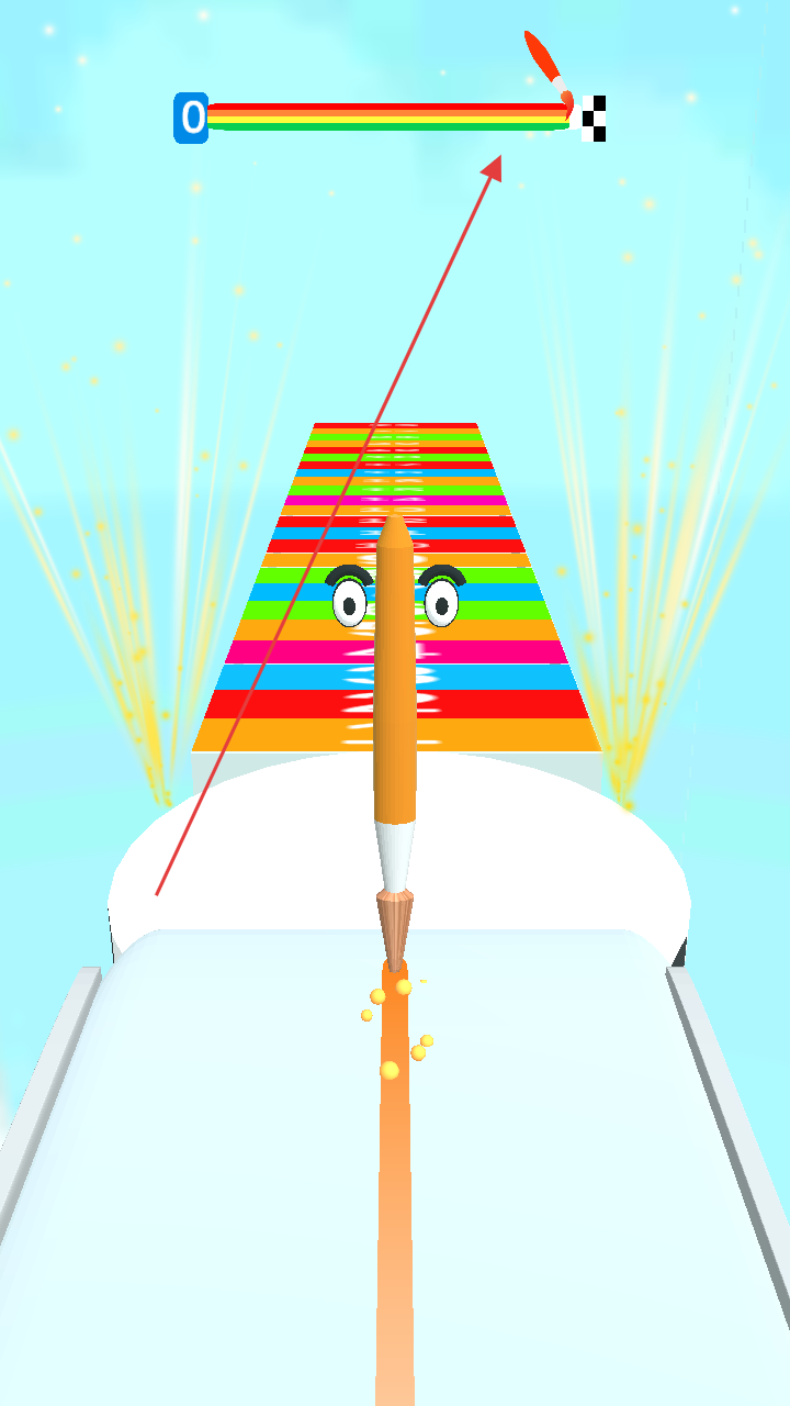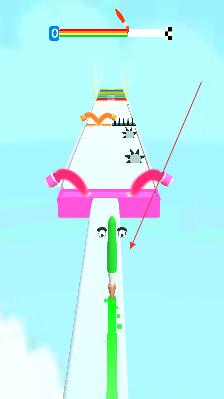 3、一路躲避障碍、收集颜料,让画笔抵达彩虹终点区域,完成关卡目标,解锁后续游戏内容。