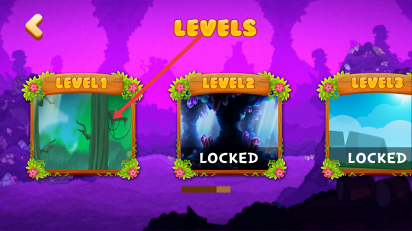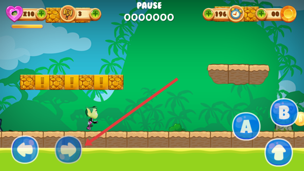 2、在关卡场景,操控角色移动,按箭头指引,跳跃障碍,收集金币、道具,推进“LEVEL-1”流程。