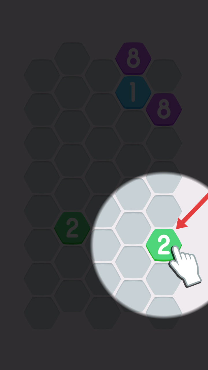 1、点击绿色标有【2】的六边形,触发游戏玩法引导,通过首步交互熟悉格子点击操作逻辑。