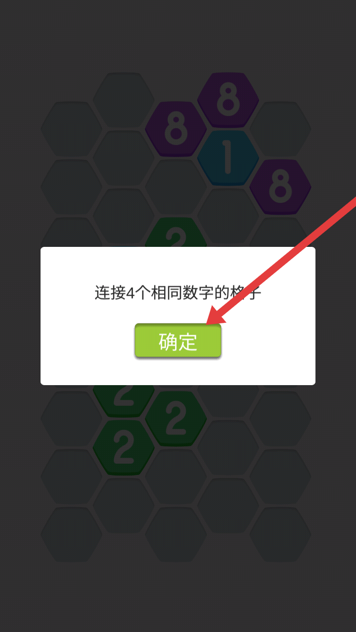 2、点击弹窗内绿色【确定】,明确“连接4个相同数字格子”的规则,为后续关卡行动奠定认知。