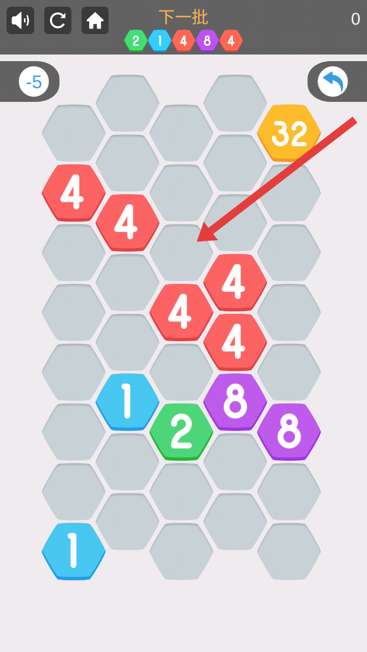 3、观察红色【4】六边形分布,沿六边形网格的相邻关系,规划路径串联同数格子,达成消除条件。