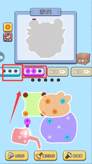 2、注意收集不同颜色的螺丝钉并按要求分类存放,完成收集目标才能顺利过关。合理利用特殊道具能更快达成任务条件。