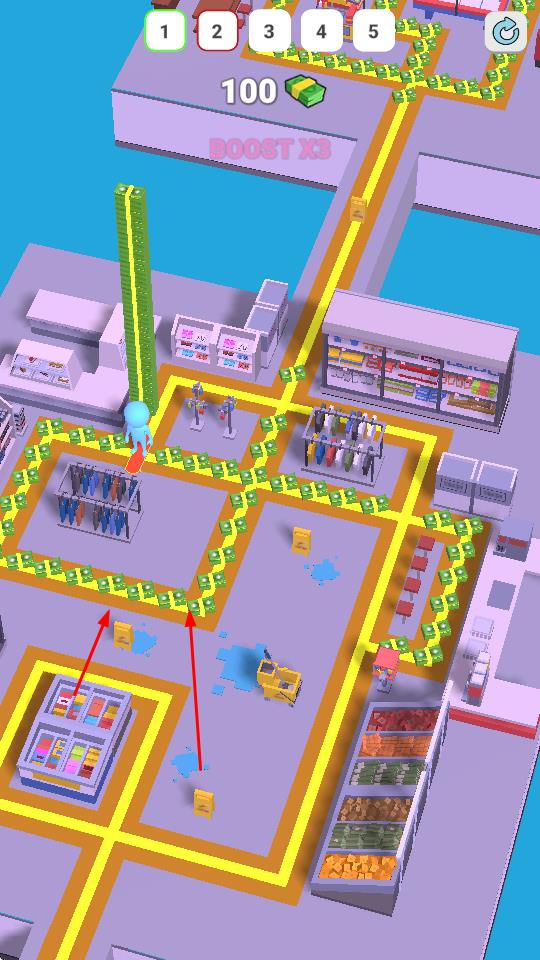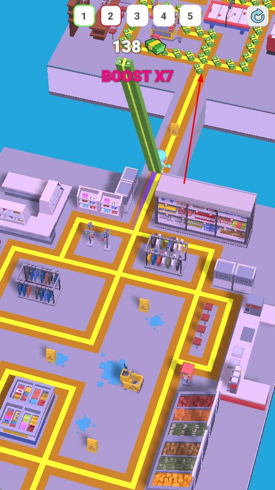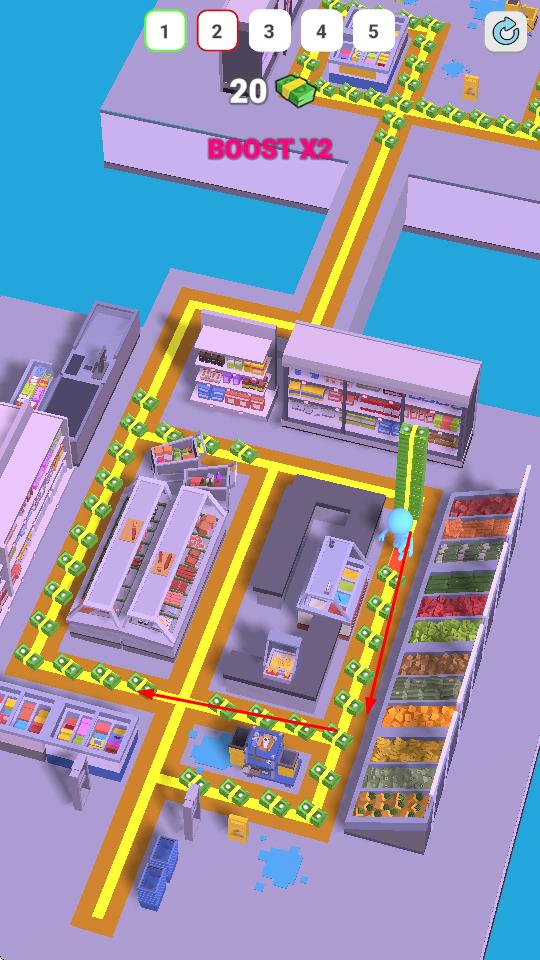 1、“超市跑酷”,操控蓝色小人,沿超市金币路径奔跑,避开障碍,按路线前进。