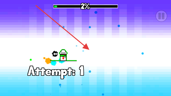 2、对局中,观察箭头指向区域,预判障碍(如尖刺、缺口),点击屏幕跳跃、转向,保持存活,推进进度条(2%→更高),完成关卡。
