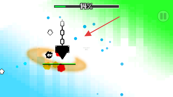 3、遇到悬挂障碍(链条重物),提前调整路线,通过跳跃、变向,避开撞击,利用彩色小球增益,提升生存能力,突破14%进度,挑战高分。