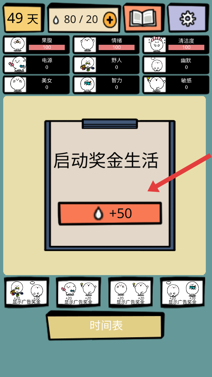 2、开局需要点击“启动奖金生活”的橙色【+50】按钮,来获取水滴资源,助力提升我们角色生存属性。