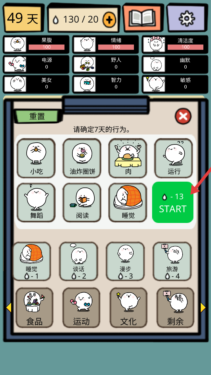 3、选定7天行为后,点击绿色【START】(消耗13水滴),启动规划的养成日程,推进游戏进程。