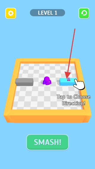 1、规划紫色小人行进路线,避开灰色障碍,确认后点【SMASH!】让小人移动,完成关卡。