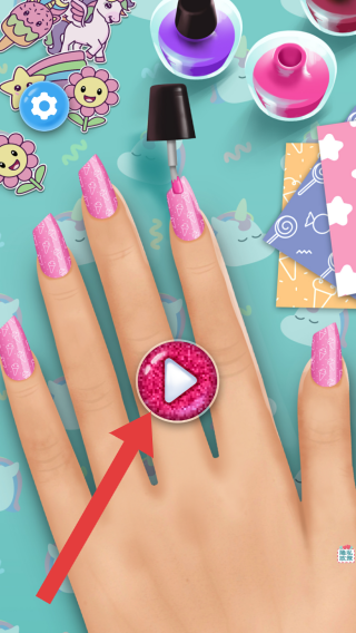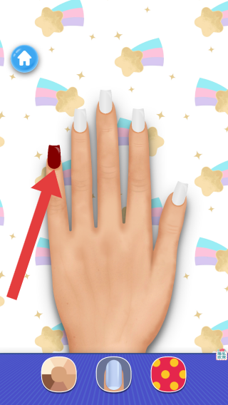 2、呈现手部美甲操作场景,有美甲颜色、样式选择(底部按钮),属于模拟经营美甲店顾客做美甲的步骤,实体信息围绕美甲设计制作展开。
