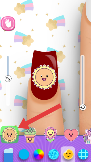 3、呈现美甲贴纸选择场景,有太阳、多肉植物等装饰贴纸,属于模拟经营美甲店中为美甲添加装饰的步骤,实体信息围绕美甲个性化装饰展开。