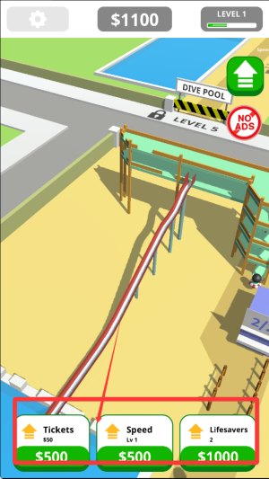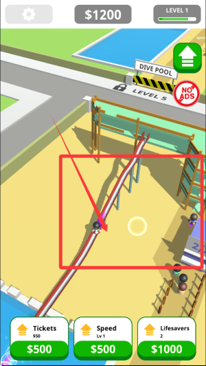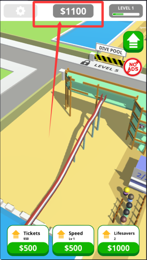 1、玩家需要规划水上乐园布局,建造各种水滑梯、游泳池等设施吸引游客,通过合理经营赚取金币升级设施。