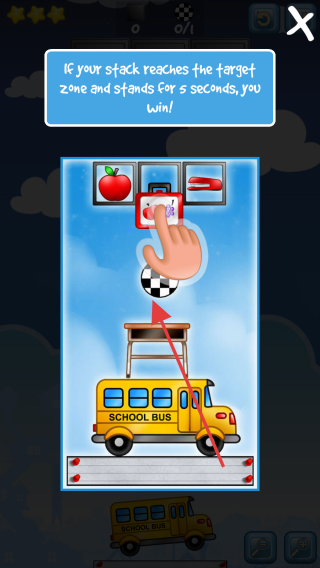 3、按指引点击物品(如行李箱),将其精准放至校车上方堆叠区,保持堆叠5秒不倒,完成挑战,解锁新关卡,提升堆叠技巧。