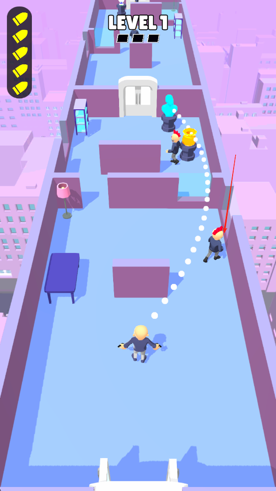 1、进入游戏后,先观察当前场景的敌人位置与障碍物分布,按住屏幕召唤子弹的虚拟弧形路线,仔细调整路线走向,待时机成熟时放手发射子弹。