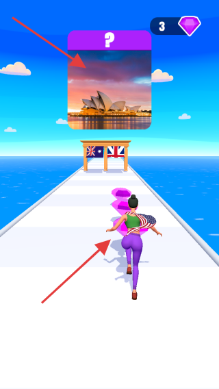 2、奔跑中,遇到带有地标(如悉尼歌剧院)的紫色问号方块,选择正确路径穿过,获取奖励,继续闯关。