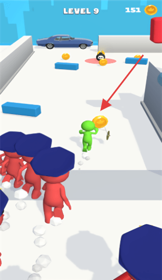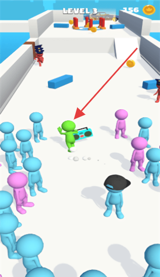 3、到新场景,绿色角色获取新道具,利用道具吸引或互动,通过人群区域,完成关卡。