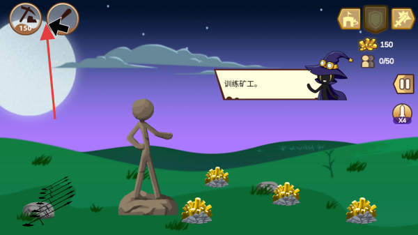 3、对局中,点击左上角【矿工】图标,消耗金币(150)训练矿工,采集金矿,扩充资源,用于升级建筑、招募士兵,增强实力。