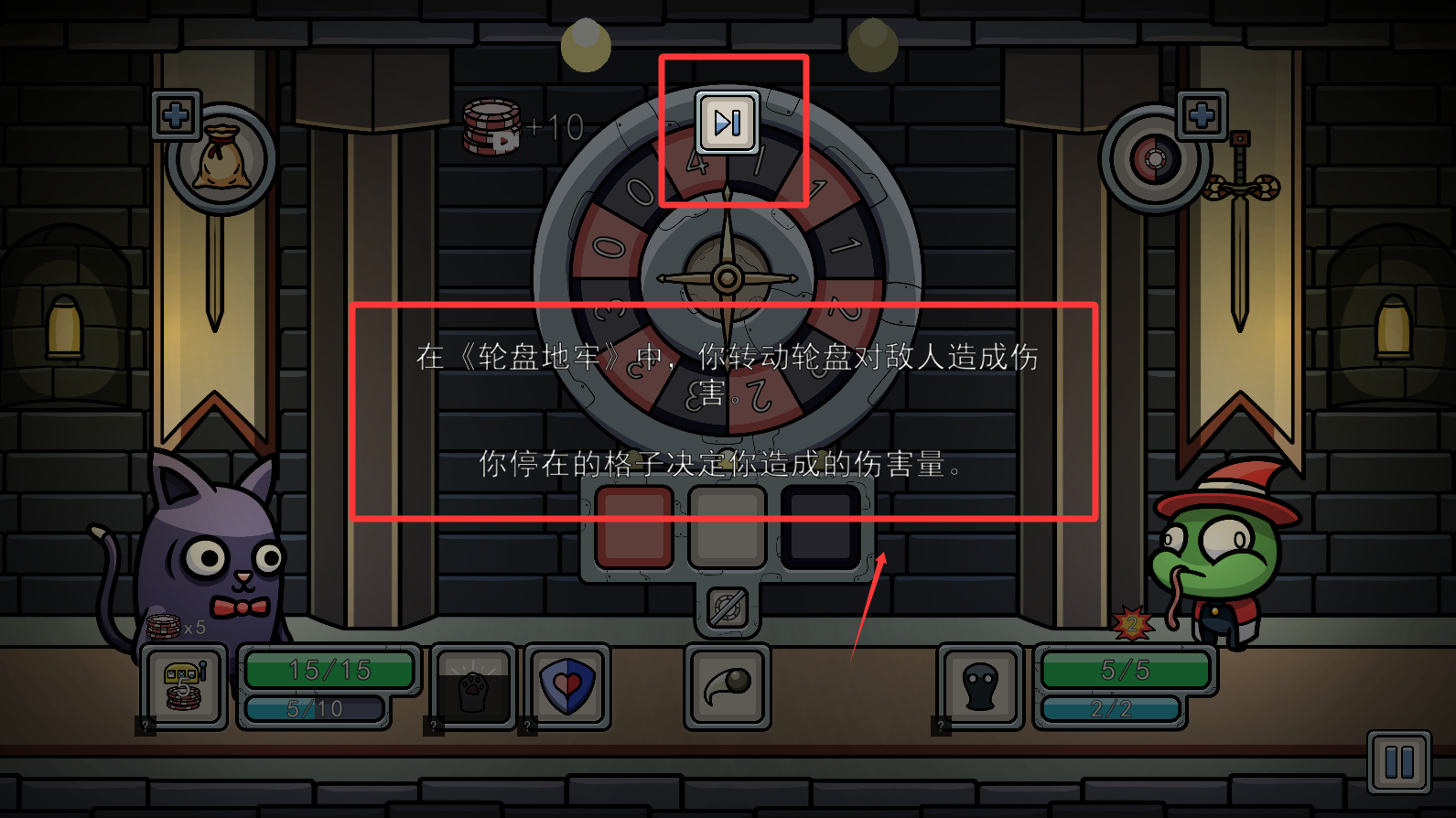 2、根据提示地牢旋转的就是敌人的伤害,你停在的格子就是自己的伤害。
