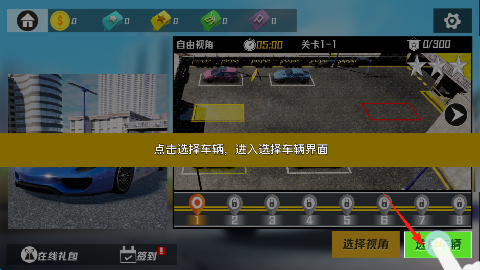1、在游戏初始界面,点击“选择车辆”按钮,进入车辆挑选页,界面显示关卡(1-1)与时间限制(05:00),通过选车为停车挑战做准备,不同车辆有独特操控体验。