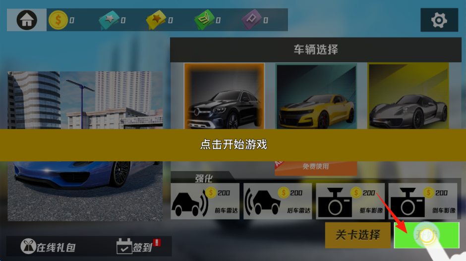 2、进入车辆选择界面,选定心仪车辆后,点击绿色按钮开始游戏,可给车辆加装“前车雷达”等强化道具,提升停车成功率,通过搭配道具与选车,定制停车策略。