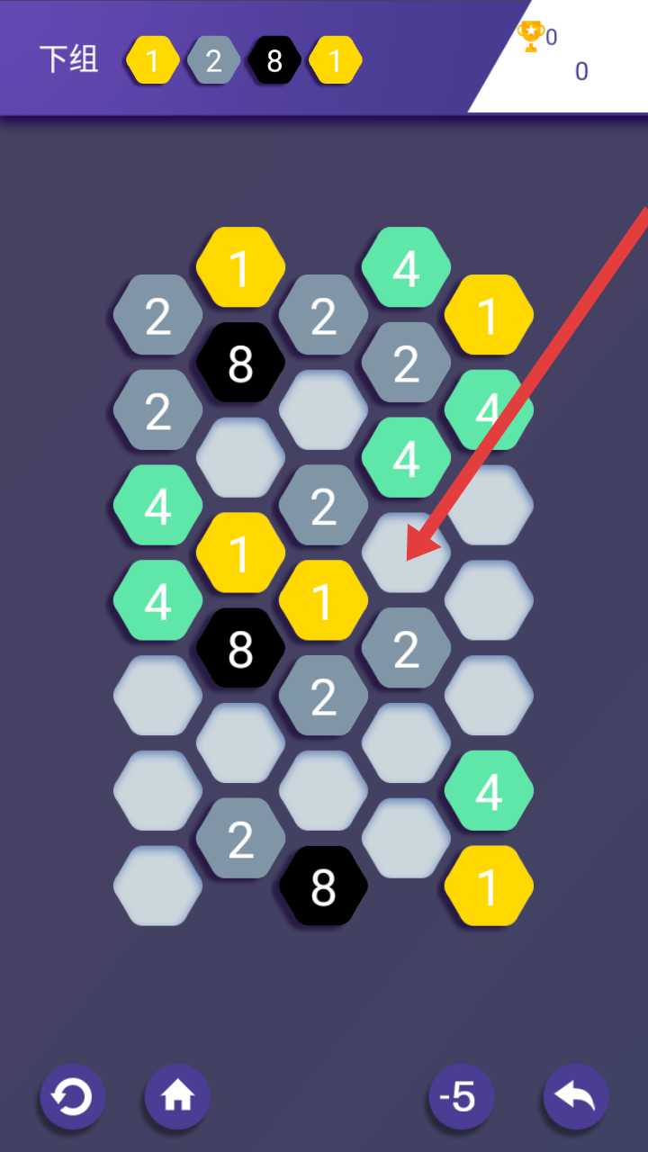 1、点块移至空白格:点击一个数字六边块,选择空白格子后移动过去,移动需在无其他数字块阻碍的线路上进行,确保数字块能顺利到达目标位置,为后续做准备。