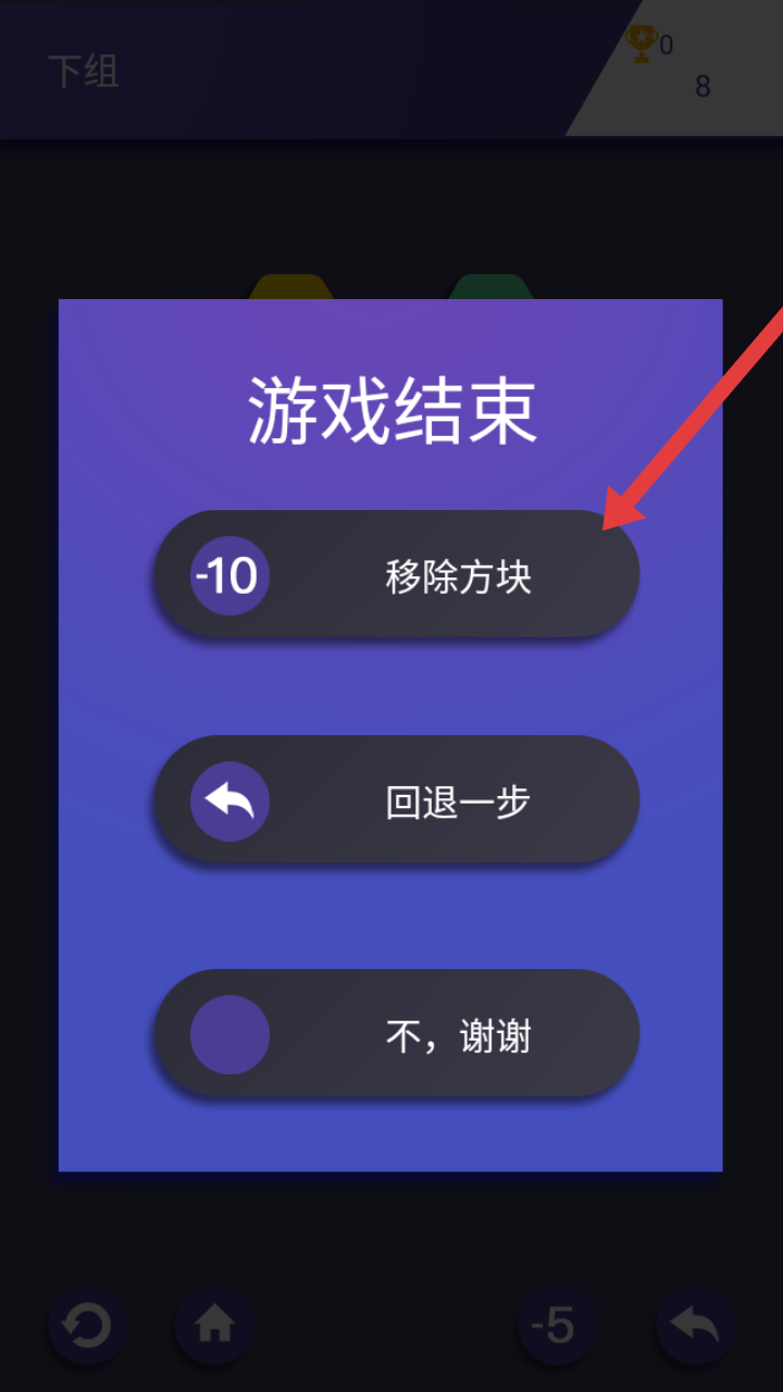 3、游戏结束后,可选择【移除方块】(消耗-10点数)清除阻碍,或回退、退出,灵活应对残局。