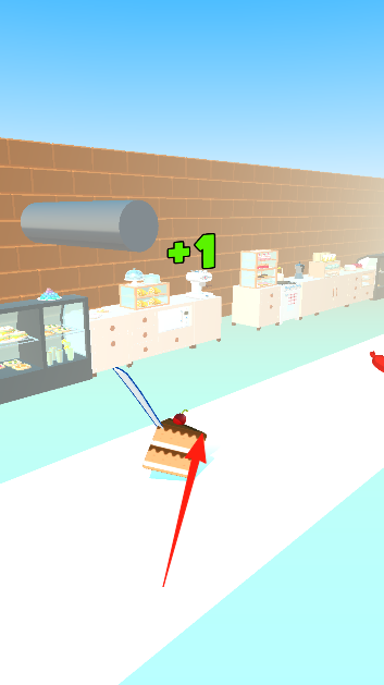 2、叉子成功接住蛋糕,继续沿轨道前行,过程中留意“+1”标识区域,引导叉子经过该区域,收集增益效果,助力后续跑酷闯关。
