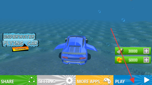 1、在主界面,点击【PLAY】,消耗金币/钻石(如30000/50000),进入水下竞速场景,驾驶飞行汽车,开启生存挑战。