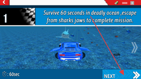 2、阅读任务提示“Survive ..escape from sharks”,点击【NEXT】,准备躲避鲨鱼,在60秒内完成生存任务。