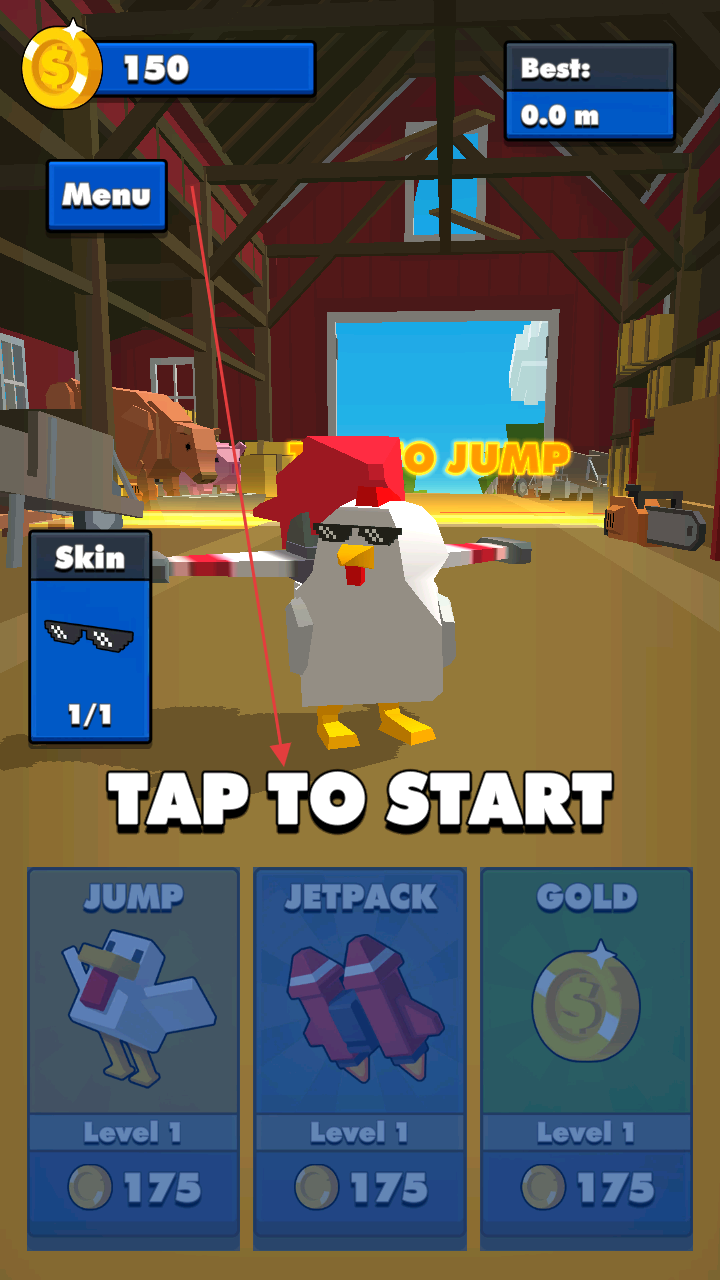1、在初始界面,点击“TAPTOSTART”开始游戏,操控戴墨镜小鸡,利用场景准备冲刺。