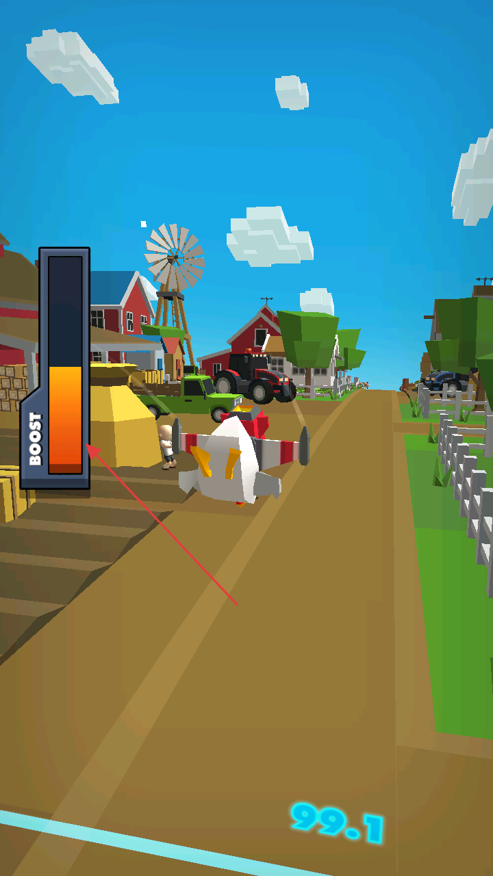 2、小鸡沿道路飞行,关注“BOOST”能量条,适时触发加速,躲避障碍,延长飞行距离。