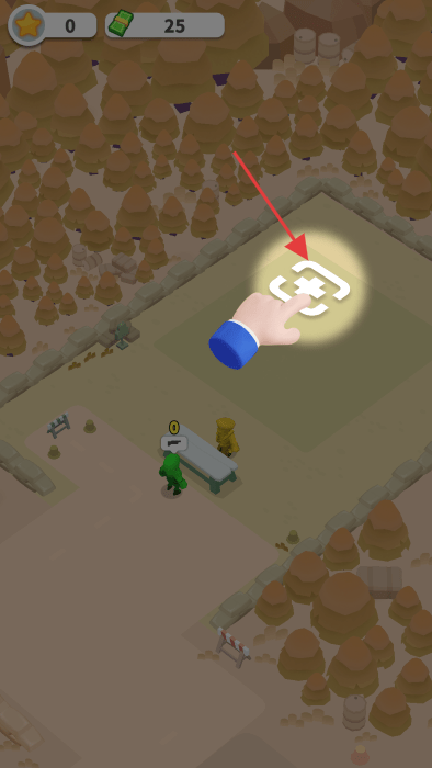 1、“营地建设”,点击营地加号标识,消耗金币(25→5),建造/升级建筑(绿色小屋),扩展营地。