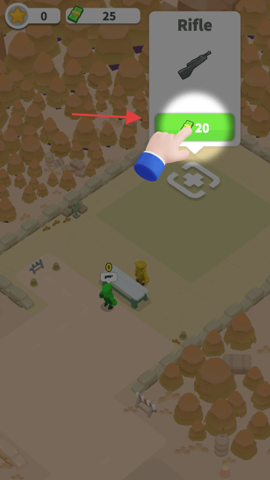 2、“武器购买”,在建筑界面,花费金币(20)购置武器(Rifle),提升角色战斗能力。