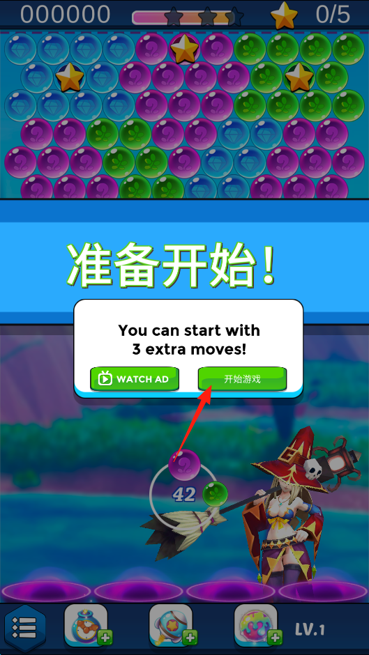 1、进入泡泡龙关卡准备界面,可选择“WATCH AD”获取额外3步,或直接点“开始游戏”,点击后,操控角色发射泡泡,匹配3个同色消除,利用开局步数选择机制。
