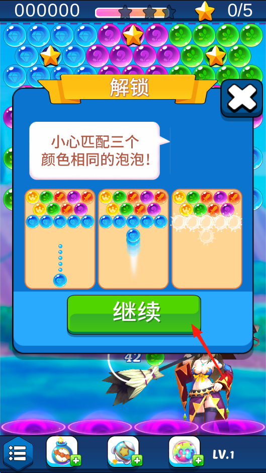 2、弹出解锁提示,展示匹配3个同色泡泡的规则演示,点击“继续”进入正式消除,需精准发射泡泡,让下落泡泡与同色连成3个,触发消除、清屏,借规则引导。