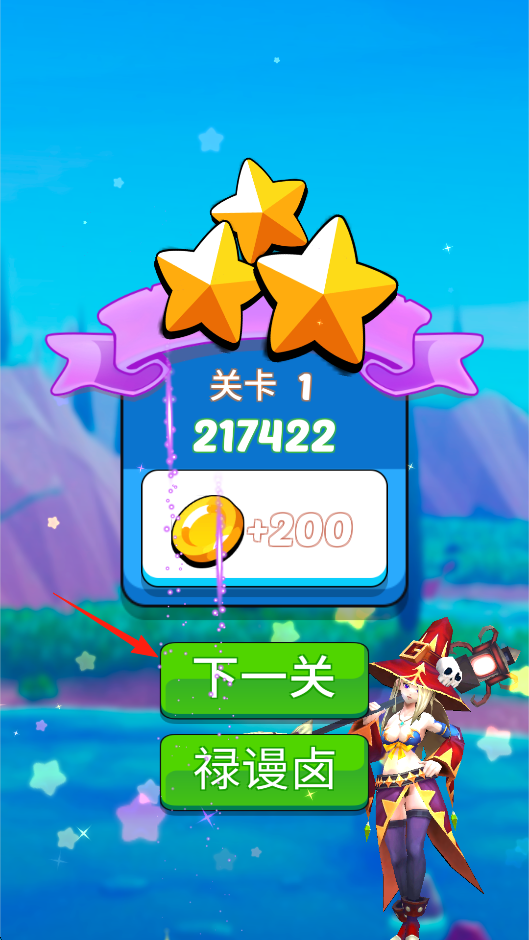 3、完成关卡1,弹出三星评价与金币奖励,点击“下一关”进入新挑战,,体验难度递增的消除玩法,利用星级评价与奖励,激励挑战更高关卡,感受成长与进阶机制。