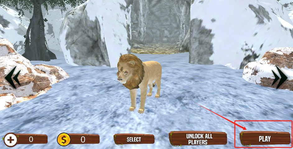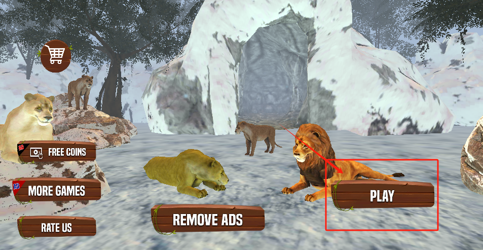 1、点击右下角红框里的“PLAY”按钮,即可开启你的狮子模拟冒险游戏,正式进入原始丛林世界。