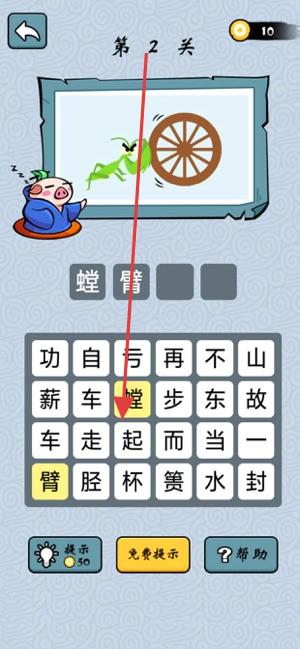 1、进入第2关,观察画面元素(螳螂、车轮),从下方字格选字,拼出“螳臂当车”成语,完成关卡。