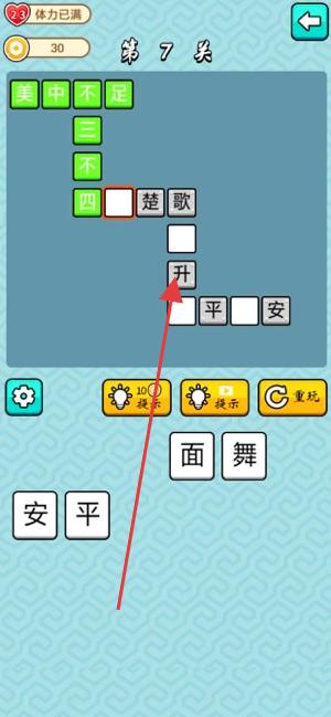 3、第7关利用已有字,选择下方字卡,补充“四面楚歌”“天下太平”等成语,完成填空闯关。