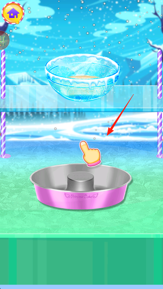 2、制作冰雪公主蛋糕时,进入原料准备环节,按指引将蓝色冰碗里的材料,倒入粉色模具,模拟蛋糕糊浇筑,通过精准操作,让材料填满模具,为后续冷冻、装饰奠基。