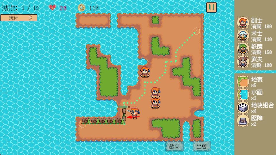 3、“波次防御”,应对1-19等多波敌人进攻,根据战况调整兵种,坚守岛屿,完成关卡。