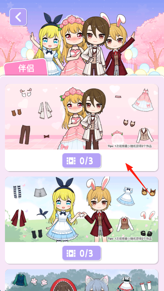 3、来到伴侣装扮关卡,界面展示不同主题的伴侣套装(如粉色系、蓝白色系),点击“观看视频”按钮(0/3),观看广告解锁对应套装部件,收集部件为伴侣角色换装。