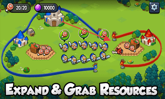 1、“资源抢占”,指挥部队沿路径扩张,占领资源点(食物堆),积累资源(宝石、食物)。