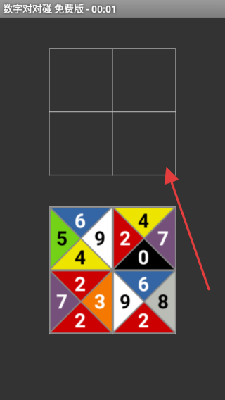 1、游戏初始,下方彩色数字方块为操作区,上方空白方格是目标区,需将下方方块移至上方,匹配数字与位置,完成拼图基础布局。