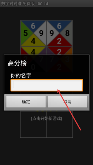 2、游戏结束弹出【高分榜】,在“你的名字”输入框填写昵称,点【确定】可记录成绩,点【取消】则不保存,之后可点开始新游戏。
