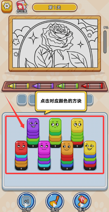 1、游戏开始后,玩家需观察色块分布,点击选取对应颜色进行调色笔填充。