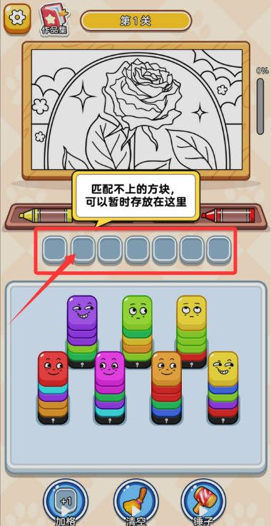 2、遇到暂时无法匹配的色块,可将其暂存于中央空白区域,待找到合适位置再使用。